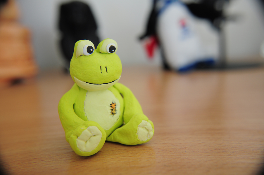 Żaba zrobiona z gliny samoutwardzalniej i pomalowana farbami akrylowymi.